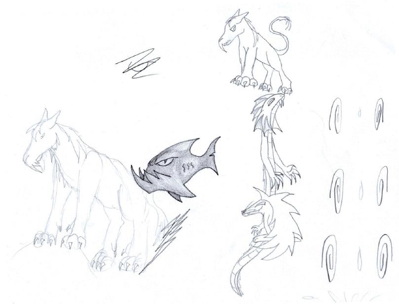 These are just some concepts of a creature I invented. The first picture consists of a few drawings I did spontaniously. There was the first time I drew it. It looks like a dragon but it should be a mixture of a horse and a lion.