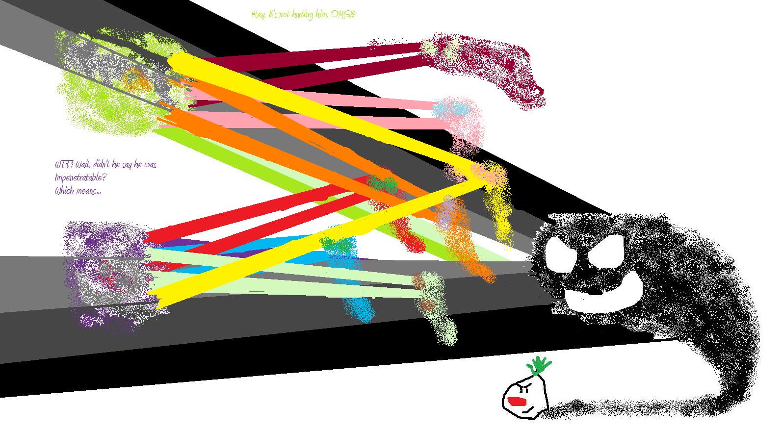 S.P.U.D. and the impenentratable negative shadow mess team up, S.P.U.D. going for the pup technique, and the impenentratable negative shadow users the pwnerliser laser, whicch turns coloured fuzzy messes into their negatives