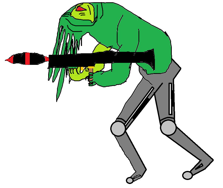 it has lots of messy tentacles (more than usual) and refuses to wear its mask, it usually takes vantage point high up in roofs and trees with its RPG, i gave it a simple name, RPG slig, but if you use it you can make any changes to it if you wish, i have drawn it but its not very good because i did it on paint, ill try and do a better one in time, but here it is (i cant draw sligs very well anyway).