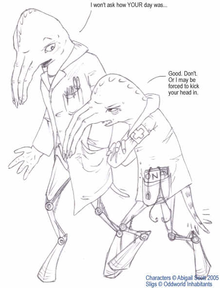 Old, oooold characters, both medically-oriented - well, if you got a clever slig, do you just shoot it and waste all that money, or do you just not teach it to shoot? I mean, why risk the ire of your patients if you can get a slig to do it? :P