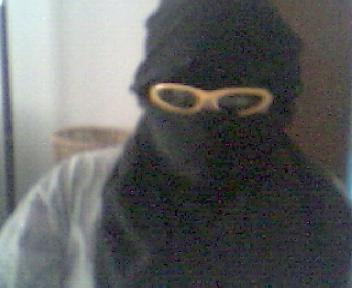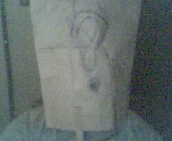 heres a pic of me wearing a bag and a question mark on my head.
