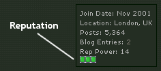 Reputation is a system based on member input, and is designed to showcase a members positive or negative contribution to the forums. The greater your reputation, the more reputation "dots" (the small coloured squares) are displayed in member stats box and profile. Furthermore, by hovering over these reputation dots you will notice that a tool-tip containing an Oddworld-themed catch-phrase is displayed. These catch-phrases (or reputation levels) are similar to titles - the more reputation you receive, the better the level you attain. These levels will also remain a mystery until such a time comes along that we release them.