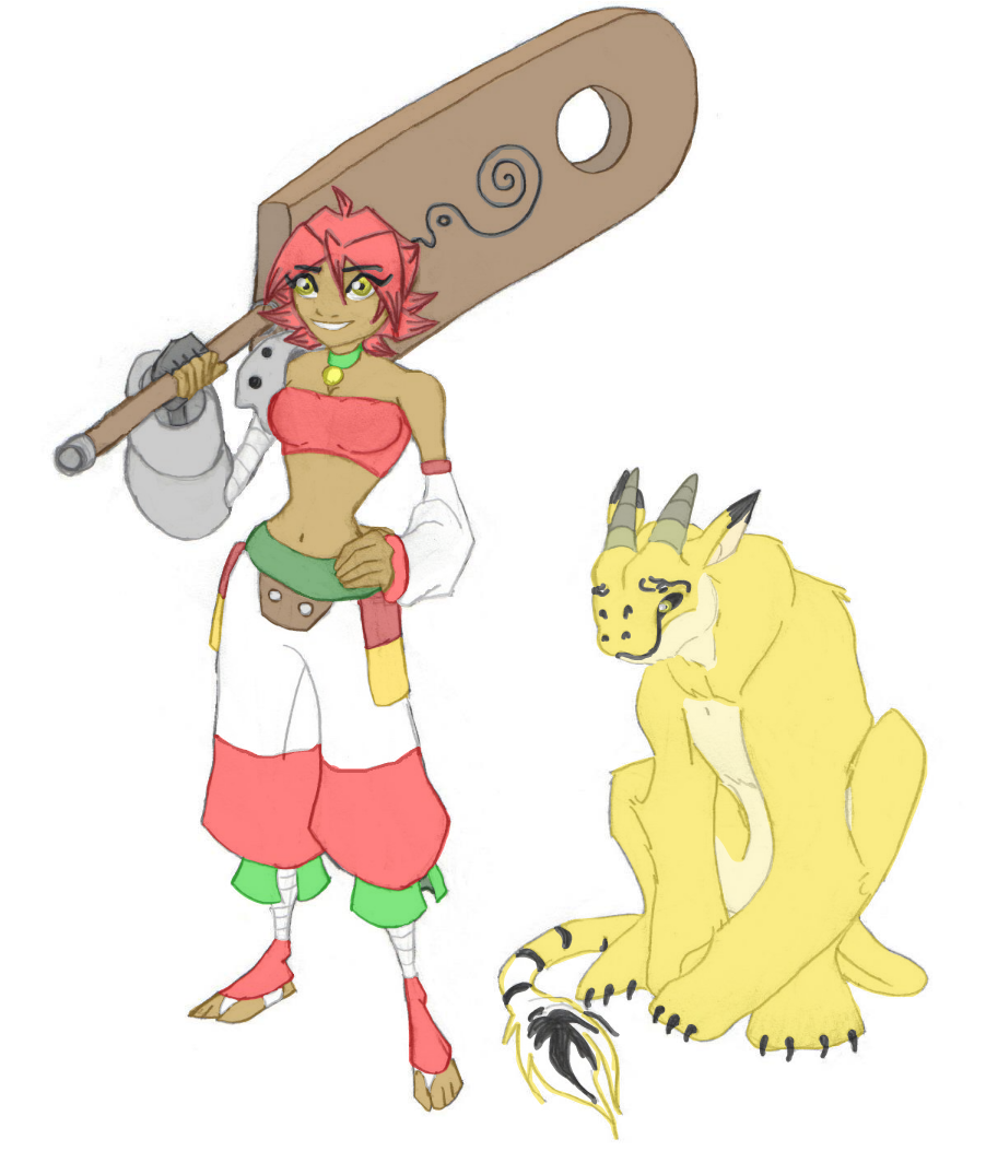 The first pic is of Aipa and Malarpok. Aipa's the girl with the giant wooden weapon (she's the protagonist), and Malarpok is her pet.