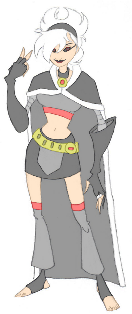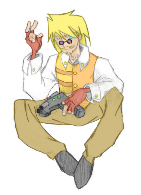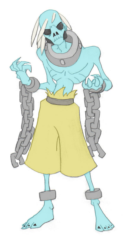 The character in the first pic here is Loki. He and his sister, Kriss, both work for Skintooth to find magical means to assist in his hunting. While Loki has worked hard on his "Maximum Overdrive" potion (with occasional sabotage by Kriss), his sister (who's in love with the Captain) is more than ready with her "Undead Hunting Partner" project. Impatient, Skintooth has Kriss re-animate Maze for him, and (upset at the lack of progress on the potion), jettisons Loki out of a cannon into the horizon.