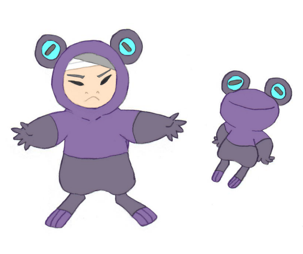 The reason he looks this way is a memory that sparks raging hatred in his thoughts. You see, when he and his sister were children, Loki was actually killed by one of her practical jokes. In order to avoid extensive punishment from their mother, Kriss implanted Loki's soul into a plush frog toy. Needless to say, he harbors quite the grudge about this.