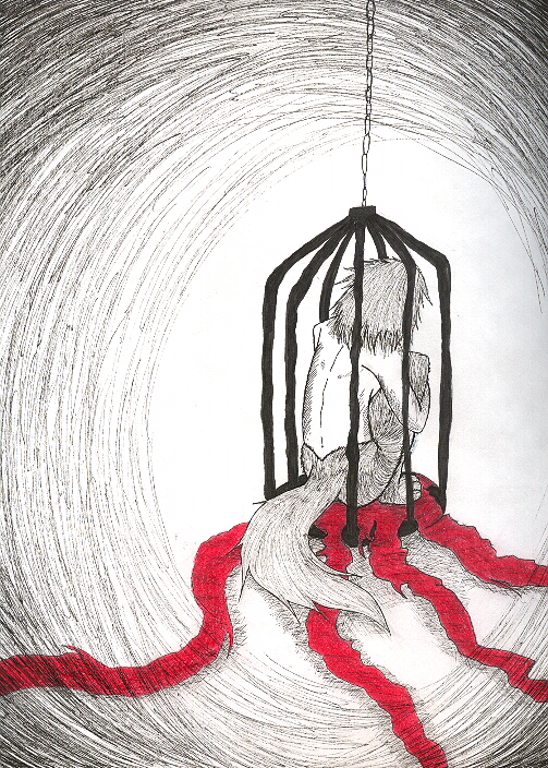 This is an image I did while mulling over the words of Carl Jung, whose theorized that every person has a "shadow-self," a part of the mind made up of all the repressed instincts, desires, and thoughts in one's life. One of the major problems with modern society (or so Jung said) was that people refuse to acknowledge that they have shadow-selves, which gives the shadow-self more power over the mind and leads to schizophrenic and unthinkingly violent behavior. Here, I represented a modern shadow-self as a wolf-boy in a cage, and the still-present influence of the shadow-self as a the tattered ribbons. I don't think it turned out that bad, in any case. Stay tuned for my Jungian-inspired art .
