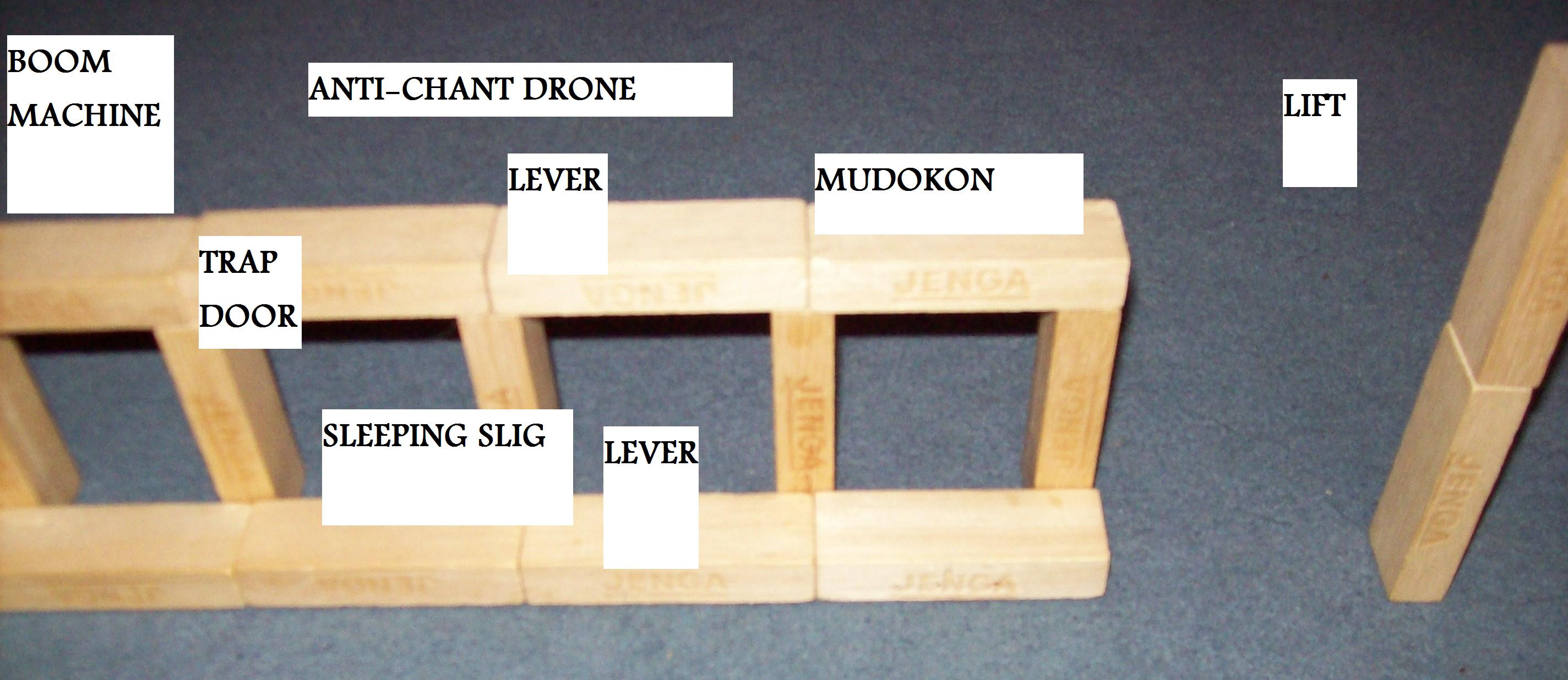 I have made ten screens from RuptureFarms (+secrets) and RuptureFarms II out of JENGA bricks then labelled them using paintbox. I want you to guess what Zulag and Door/Part they are from!