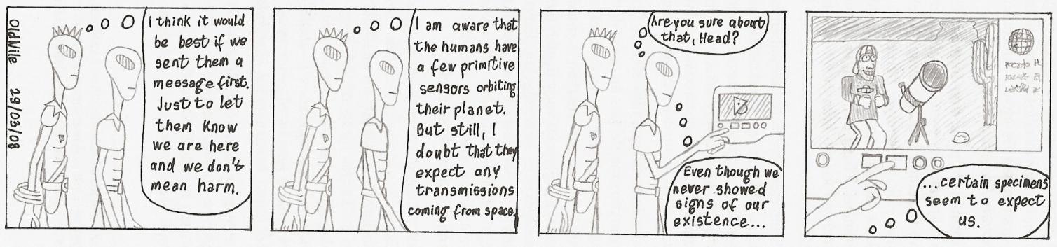 So, I started doing a comic titled Exchange Alien, made of 4-frame-strips. No details about the story yet, you will find out eventually if you become interested after the first two strips which I will post now.
