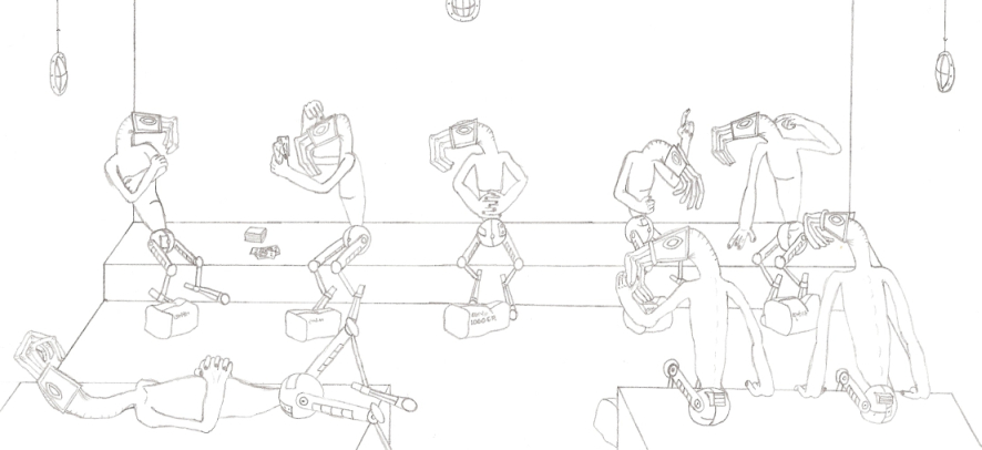 There were eight Sligs in the first cariage. Each of them had their bags at their mechanical feet. Next to the door, there was a Slig who was trying to have a nap on the bench, but the noise didn’t allow such comfort. So he ended up pretending to be sleeping. On the other side of the door, two Sligs were sitting on their bench quietly. The one sitting next to the door cast a scornful glance at the Slig sleeping on the bench. He leant closer to his neighbour on his right.
