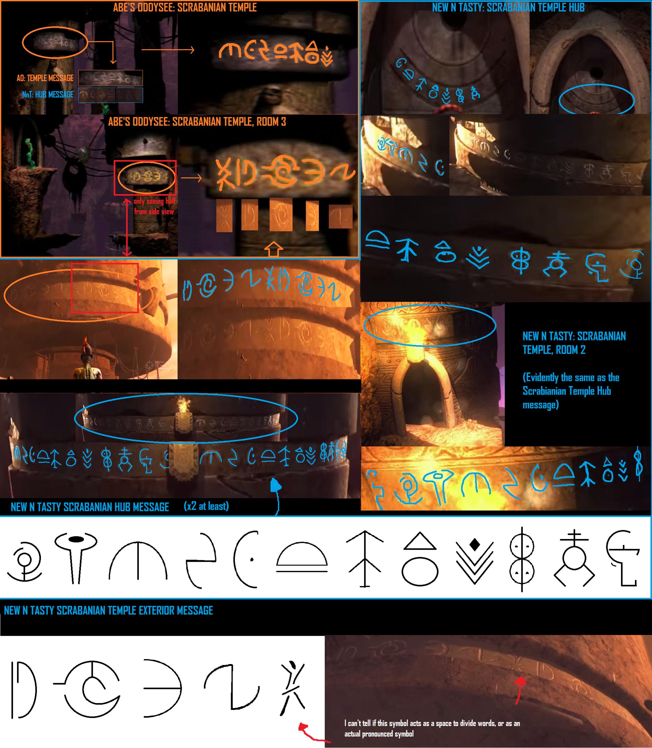 This text very much interested me, so I decided to search for other examples of Mudokon script around Abe's Oddysee, and was not disappointed. The Scrabanian Temple shares many of the same symbols in both games, and even certain phrases or patterns of symbols are repeated (although one example has two symbols swapped in the New n Tasty version) over from Abe's Oddysee in New n Tasty.