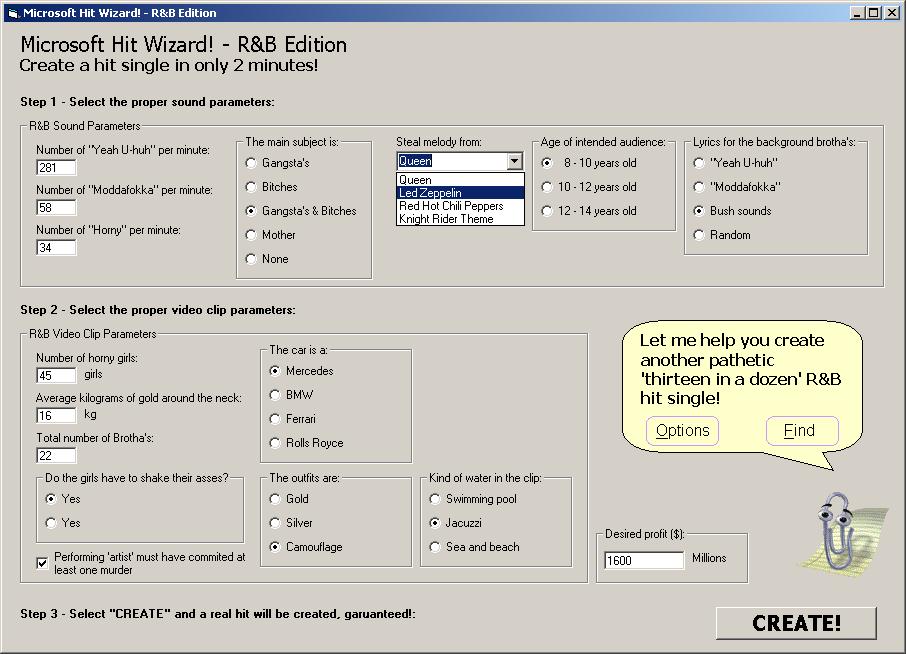 I personaly would have to start with Spitney Bigears. Her "hit" songs, "Oh boobys boobys(take my booby's one more size)" based on her breast surgury, and "Oop's, I farted again," makes me have to say that my suckyness scale for Britney Spears is at...99.9/100% suckyness! Next, Christina have-no-hair-a, "Weenie in a bottle," "Plunge on over," and "What a girl looks at," tell me my suckyness scale for Christina Agulaira is...... 99.999/100% suckyness!!!! Last, but not least, N Sink and go to heck..."die die die," (the song that makes me wanna Kill N Sync), "It's gonna pea me," and "millinehummer," make the suckyness scale for N Sync is.....100/100% suckyness!!!!!! Least hated: Britney Spears! Congragulations, Sitney...you win a prize!!! *SMASHES BRITNEY WITH AN ANVIL* YOU DESERVED IT!!!!! The End of my first make fun of singers! Stay tuned for "Blackheat Decoys(Backstreet Boys)" and "clenchinem(EMINEM)"!!! Have a great day! Ha! Ha! the heck Ha!