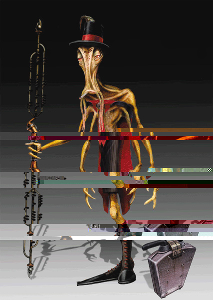 He's called a Chronicler. They are basically the accountants, lawyers and stockbrokers of Oddworld. Not much is known about them as yet, other than that they inhabit the larger cities in Oddworld and that they are an industrial based species.