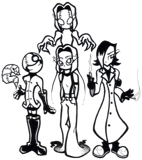 This next one is a pin-up with (from left) Patches, Cicada, and Wasabi. The poses are kinda awkward and a little stiff... but that's OK. I just wish I could draw the "shine" on leather. That would make Wasabi's boot/glove combo look so badass.
