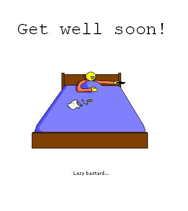 Well, Grig hasn't been here in a while becuase he has a hernia. Anyway, he just got operated on and he's doing fine, but he has to take it easy for six weeks, so he won't be on zee forums for a while. He's been laying in bed all day today after he got back from the hospital. He only gets out of bed to use the rest room and even then he needs help walking, so he's very weak right now. Don't worry though, I'm sure he'll come back in about three weeks or so.
