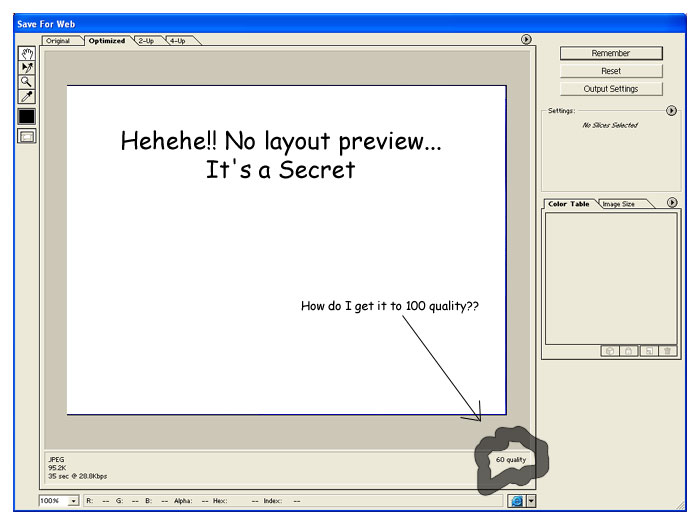 Well as you would know I'm trying to make a new layout for OWO, but I'm having trouble getting the picture, when sliced, to the quality of 100% instead of the default 60% which makes it look fuzzy o__O