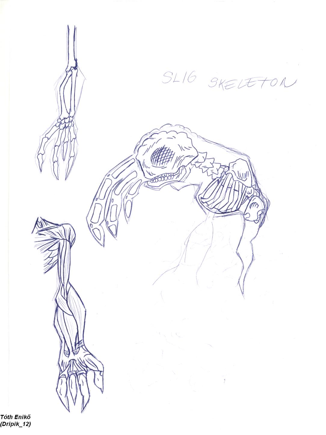 The Slig´s cool, but I was thinking it would have bones in its ´tail´. I did see in the art of oddworld book (goddamn its useful) that on close inspection, they appear to be degraded back legs, with two visible sections to them as well as the feet. Just a thought.