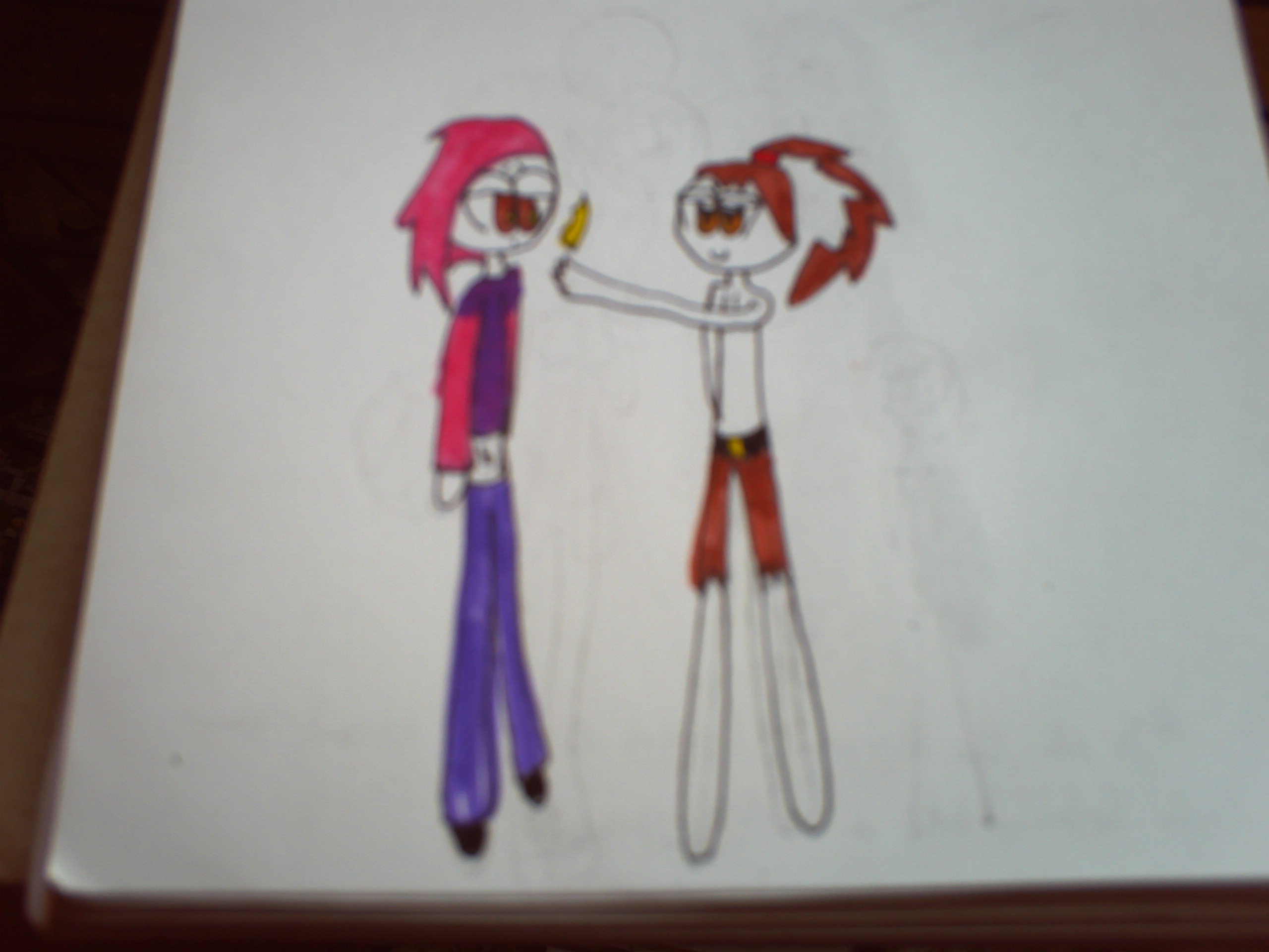 I have a new pic. This time, Abe is using his hypnotic skills (not his possession skills) to hypnotise Lulu, telling him 'You're name is Nancy and you love dresses and fuzzles'. This is just a joke. But I found it a laugh when I drew it.