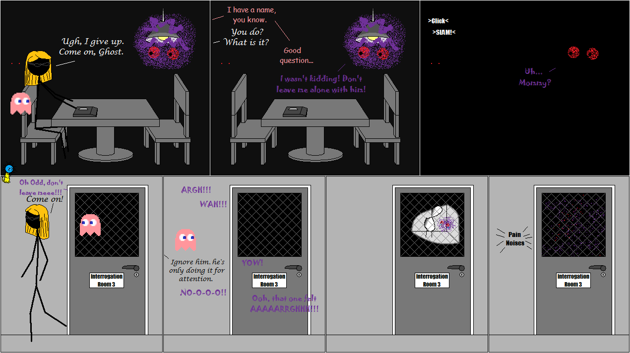 As for the last frame, that's the purple-mess being shoved up against the door right? I got a reply for that. Can't do it now though, not long until I leave for school.