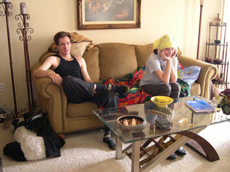 just gotten up and put my pants on. Sitting with me is my younger sister Alex, pictured wearing a home made Pikachu (pronounced Peek-At-You) hat that she found at a thrift store.