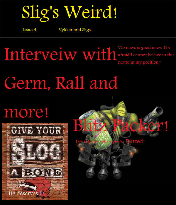 (This is just a bit of fun, so if you dont want anyone to see your contribution to this 'magazine' until the next update is posted, PM it to me, and i will post it in the next update. Or you can just post your idea's here in this thread, but they will be in public veiw so it wont be a surprise the next time SLIG'S WEIRD is updated).