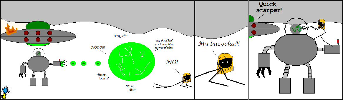 Sorry Josh but Candy is off screen for these three frames because I refuse to draw her nude. You see, since the fuzzy-messes wont die, that lovely purple dress would be prone to fly, float, teleport (I'm not entirely sure how they move) away and leave her... unveiled.