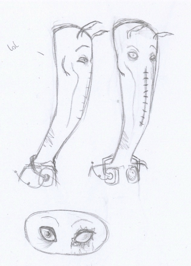 Three fingers (in the sketch), less raptor-like legs, sort of blunt, curving muzzle, blue skin. Mudokon?
