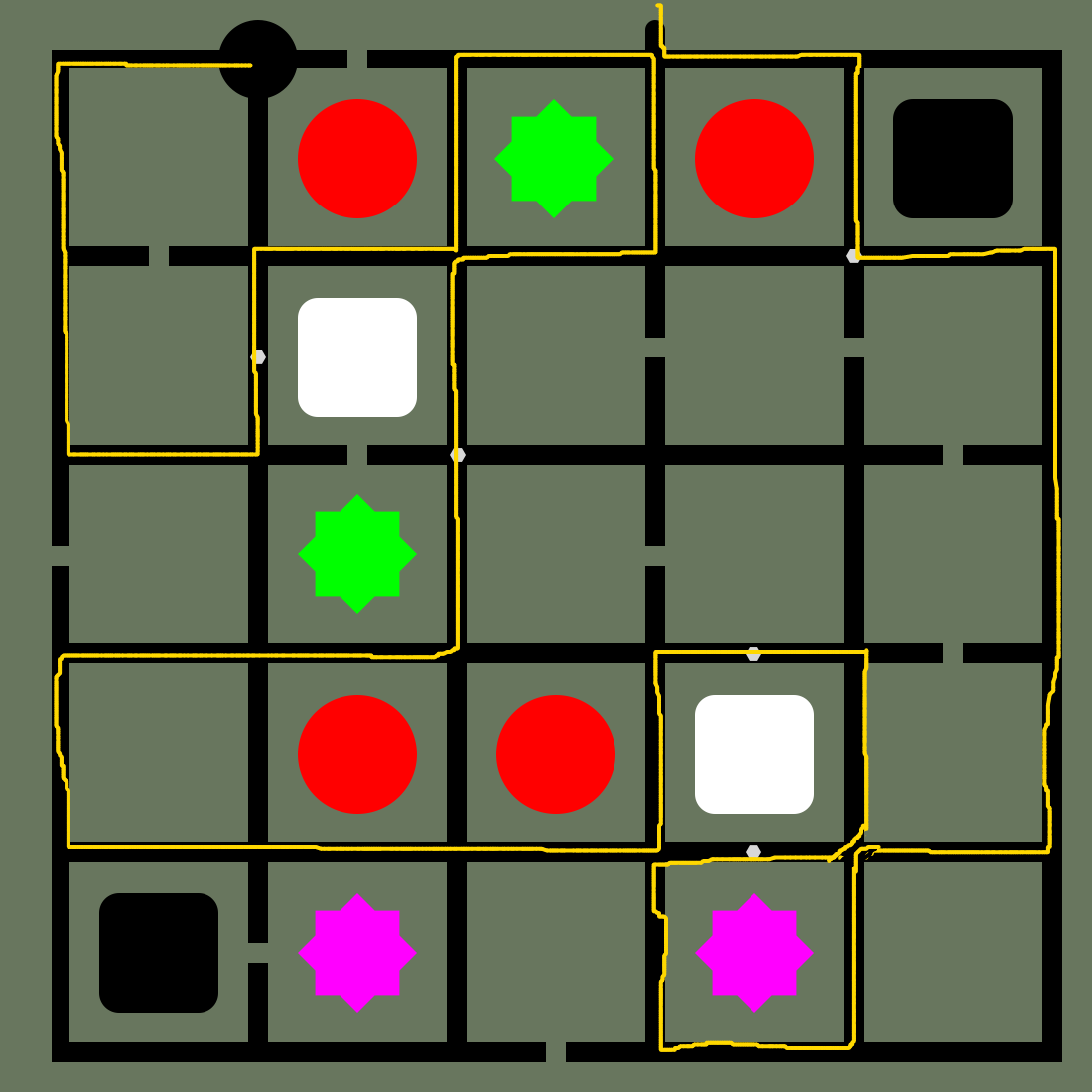 In order to complete puzzles that feature these tiny black hexagon-shaped dots, the line you draw must intersect with each one along the way before reaching the end point. Think of it like connecting the dots! You must connect all the dots before reaching the end point for this to work.
