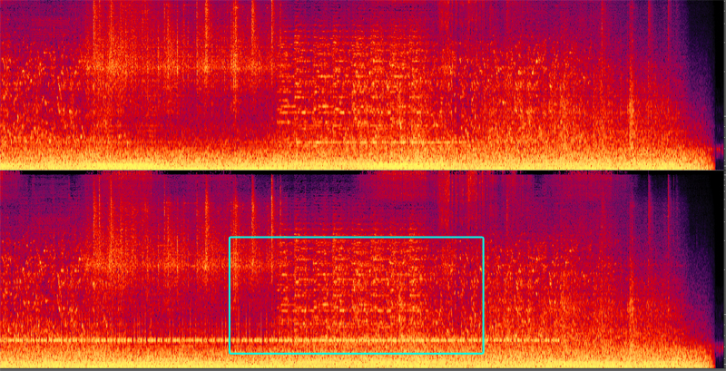 mattb150 PM’d me some spectrographs of the audio – I wasn’t able to read them too well, but the spectrograph of the reversed audio seemed to match up OK with what I’d deciphered by ear: