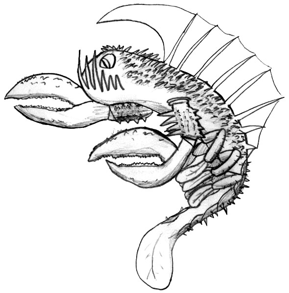 I've recently created a couple more creatures, one I call Squorms (Dunno whether to pronounce it Squirms or Skw-orms). They're a few inches long, pinkish green, wormlike. They have circular, small toothed mouths at one end, and a single, tiny, black eye. Small bottle-green scales cover their backs, and they have 10 pairs of little legs (I therefore classify them as decapedes.)