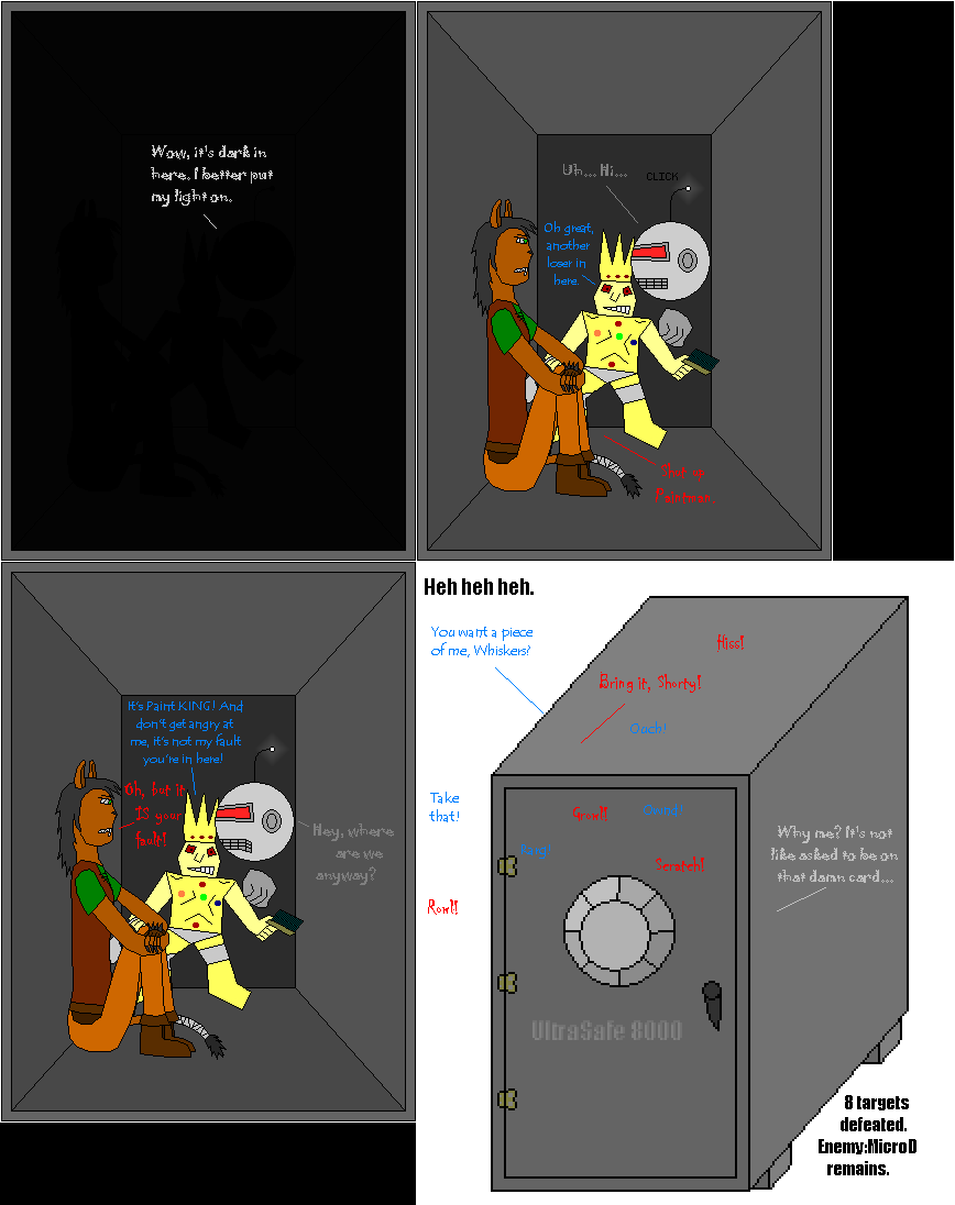Sorry about the double post but I wanted this after the comic. Just in case it wasn't clear, the comic is advertising a TV program based on the characters locked in that safe, a bit like Big Brother, only the safe is smaller than the Big Brother House, and it doesn't have a garden or a swimming pool.