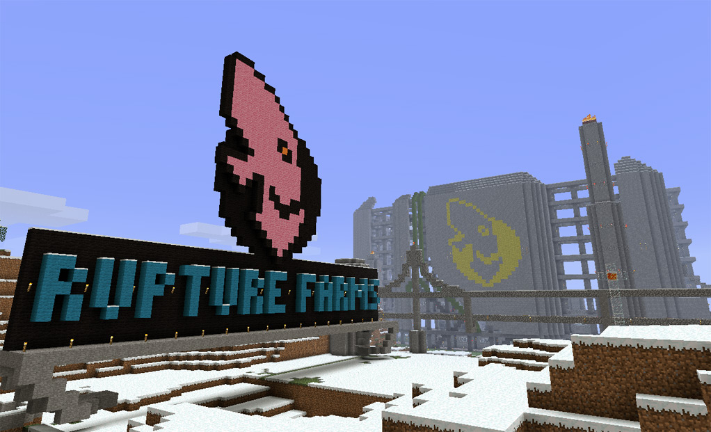 The logo is beige. There is no beige wool in Minecraft, and I wanted it to look different from the yellow "spray painted" logo on the factory front. The orange is a bit too orange, so I used pink instead.