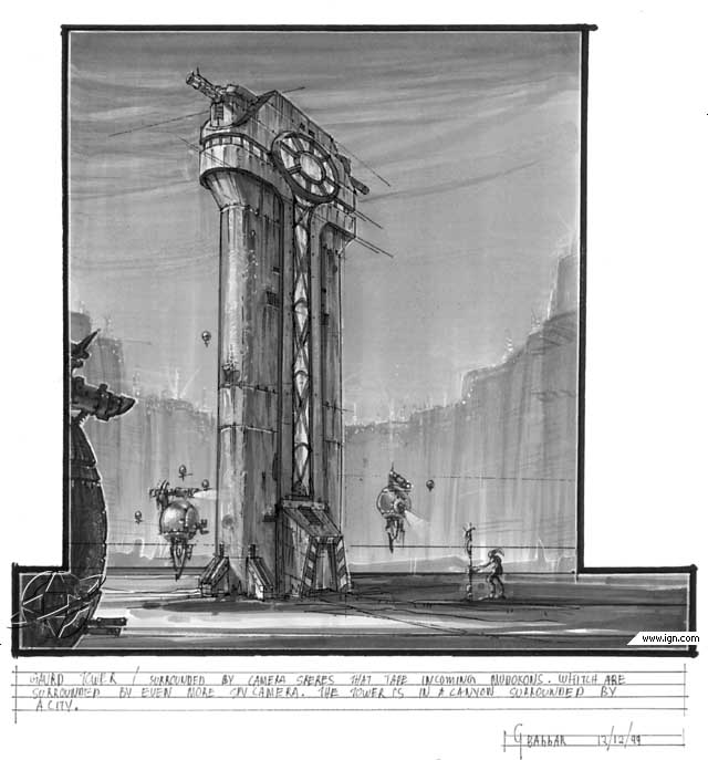 "Guard Tower / surrounded by camera sferes [spheres] that tape incoming Mudokons. Whitch [which] are surrounded by even more spy camera. The tower is in a canyon surrounded by a city."