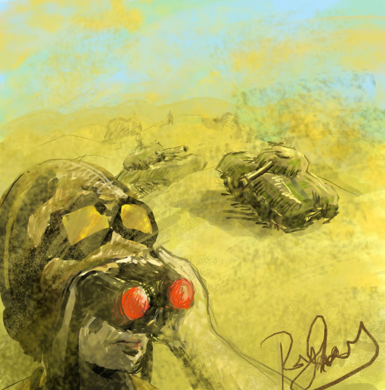 I'm not sure how, bu you've given a certain depth to the desert one. You can tell that the tanks are further off than the person, yet you can see the sand right in the drawers eyes, obviously closer than anything else. I like it.