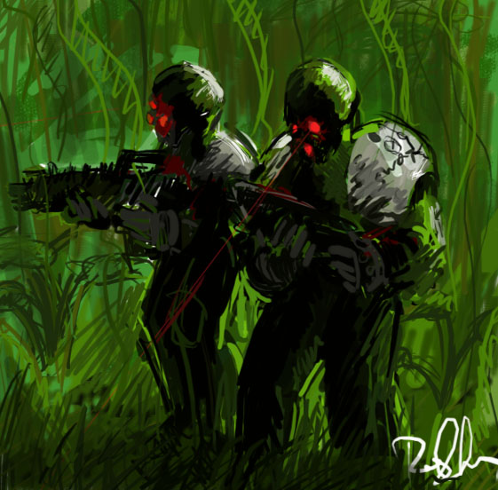 Anyway, to kick things off, here's some random painting of two... commando type guys in some jungle. You'll notice I'm not that keen on detail. The idea is that you squint and it looks real (well sorta). And yes, I know I'm not that good with colours.