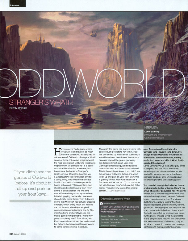 "Have you ever had a game where you put it in and loved it so much from the outset you actually had to call someone? Oddworld: Stranger’s Wrath is one of those. I’d always imagined what the mad scientists at Oddworld Inhabitants might do with (or perhaps “to” is a better word) traditional action adventure, but I never saw the hooks in Stranger’s Wrath coming. Wrangling bounties via a Ghostbusters-like contraption amidst a dusty, living, neo-western landscape in which you switch between perfectly honed action and FPS is one thing, but shooting and collecting your own “live” ammo is quite another. The first time I saw a Fuzzle sitting up on my crossbow, I started giggling maniacally. Someone should really breed these. Then it dawned on me that Microsoft had actually dropped Stranger, which pretty much just freaked me out. I mean, who drops a triple-A genre redefining masterpiece ripe for film, merchandising, and whatever else the media gods deem profitable? Have they gone completely mad? Tork, Vince, and Psychonauts I can fathom (not understand, but fathom), but dropping Stranger points to some serious internal ineptitude.
