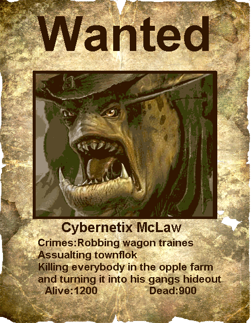 I dont know if this counts as fan art but i love to modufy stuff using paint and painshop pro.Heres 2 home made outlaw wanted posters made from the parchment desingn elements and some pictures of 2 outlaw minions i promoted to outlaw bosses.