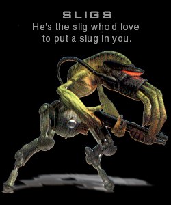 Bats, Bees, Birds, Bolamites, Boombats, Buzzards, Chroniclers, Chippunks, Clakkerz, Colour Birds, Doves, Elderlings, Elums, Fireflies, Fleas, Fleeches, Fuzzles, Gabbits, Gloktgi, Glukkons, Greeters, Grubbs, Guardians, Interns, Khanzumerz, Kintos, Luskans, Meeches, Meeps, Meetles/Mugs, Mosquitoes, Moths, Mudflubs, Mudokons, Musklums, Oktogi, Outlaws, Paramites, Ratz, Scoots/Worry Fish, Scrabs, Scuba Toads, SeaRexes, Shrinks, Shrykulls, Skeeters, Skrikits, Slegs, Sligs, Slogs, Slurgs , Sniper Wasps, Snoozers, Stangs, Steefs, Stingbees, Stunks, Thudslugs, Vykkers, Wasps, Wolvarks, Zappflies.