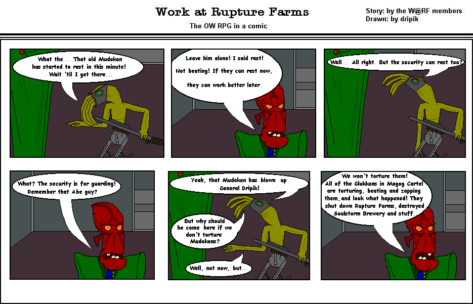 Something is messed up with this topic. I've tried to post 4 times now, and I bet this one doesn't work! As I have said 3 times before, cool comic dripik, but is it going to go right from part 1 of W@RF to Part 4, cause it'll be very long if it does.