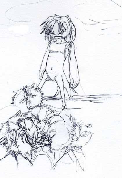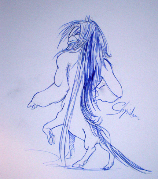 When I have a day of inspiration, I sometimes draw four or five pictures plus several sketches. Yesterday, I drew many sketches at school. Below this, Caligo and Shyridon belongs. The next three pictures will show you Shyridon from the back and from the side, crawling and Caligo sleeping.