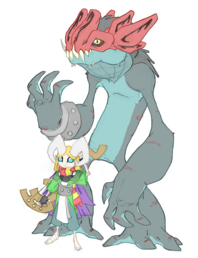 The character in the first pic here is Loki. He and his sister, Kriss, both work for Skintooth to find magical means to assist in his hunting. While Loki has worked hard on his "Maximum Overdrive" potion (with occasional sabotage by Kriss), his sister (who's in love with the Captain) is more than ready with her "Undead Hunting Partner" project. Impatient, Skintooth has Kriss re-animate Maze for him, and (upset at the lack of progress on the potion), jettisons Loki out of a cannon into the horizon.