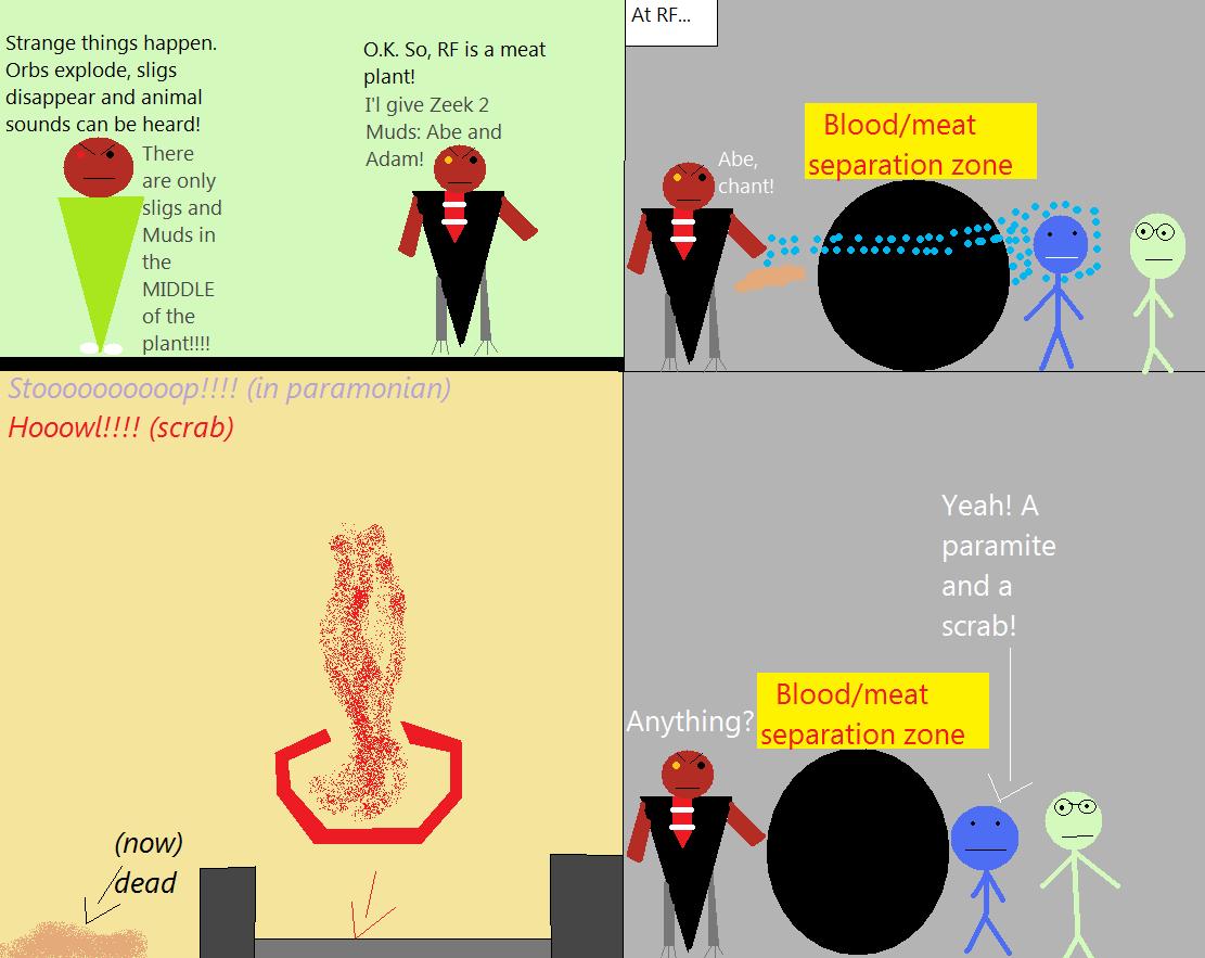 One day a bigbro slig(Name:ZEEK) and 3 sligs were walking trought rupturefarms.The sligs were in front. Zeek heard a scrab (Exoddus:howl 4 power) and he turned to see what is happening.He saw notingWhen he turned back the sligs were gone,but where? They wear pants.He would hear them. He ran to Aslik(he was younger and he was the Boss of rupturefarms)to tell him what happend.