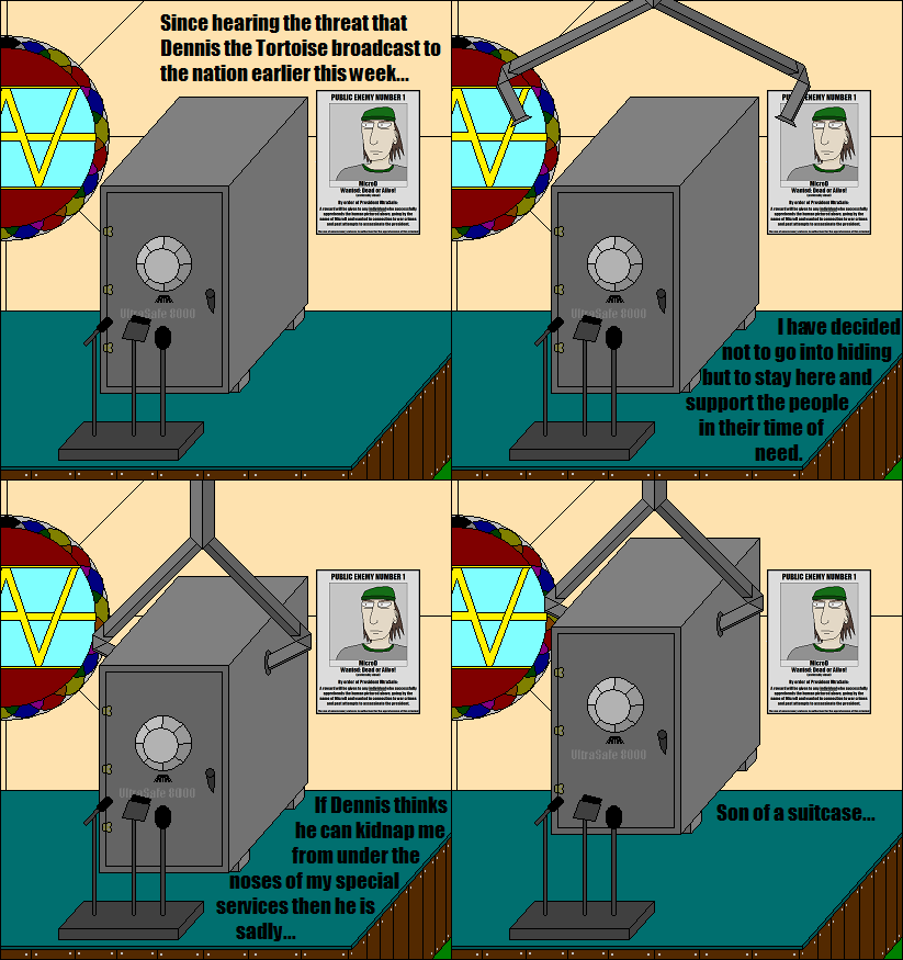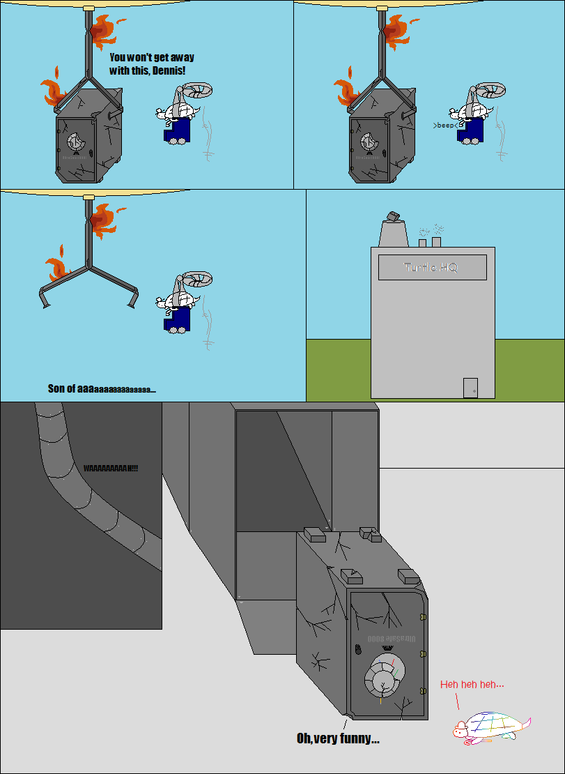 So hang on, UltraSafe's being held captive by a turtle who can't even talk?! Well how am I supposed to build up a joke when only one of the characters involved can speak? This is going to make all the comics I had planned significantly more difficult. Guess I'll just have to think up something more cunning...