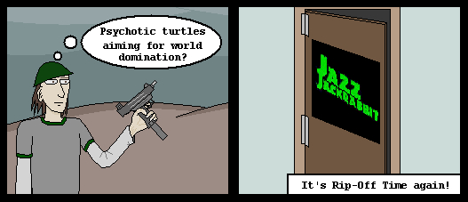 Ol' Fran the Hobo Turtle: He was evicted from his shell, so he wears a metal bucket on his back. He scrounges for scraps of food and steals from people even when their right in front of him.