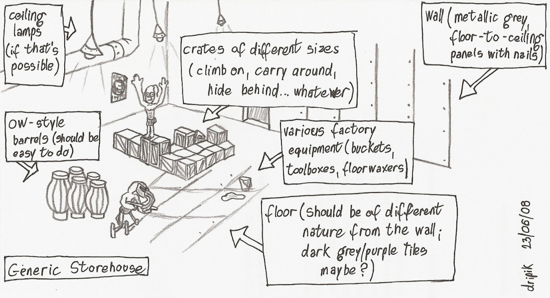OK, I shall start the flood of concept art then. I did a sketch yesterday when I left the OW dream, about a possible Industrial area. Also added some of my ideas, seen in the textboxes. Tell me what you all think.