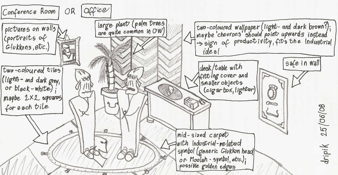 Executive Office: Where glukkons live. Stick a fone in a corner maybe, some glukkon beds... Make it pretty! If a mud enters and there are no glukkons they gain moolah. If there is a glukkon inside they instantly loose all their moolah. If a slig enters any glukkons inside can choose to give or take moolah from them.