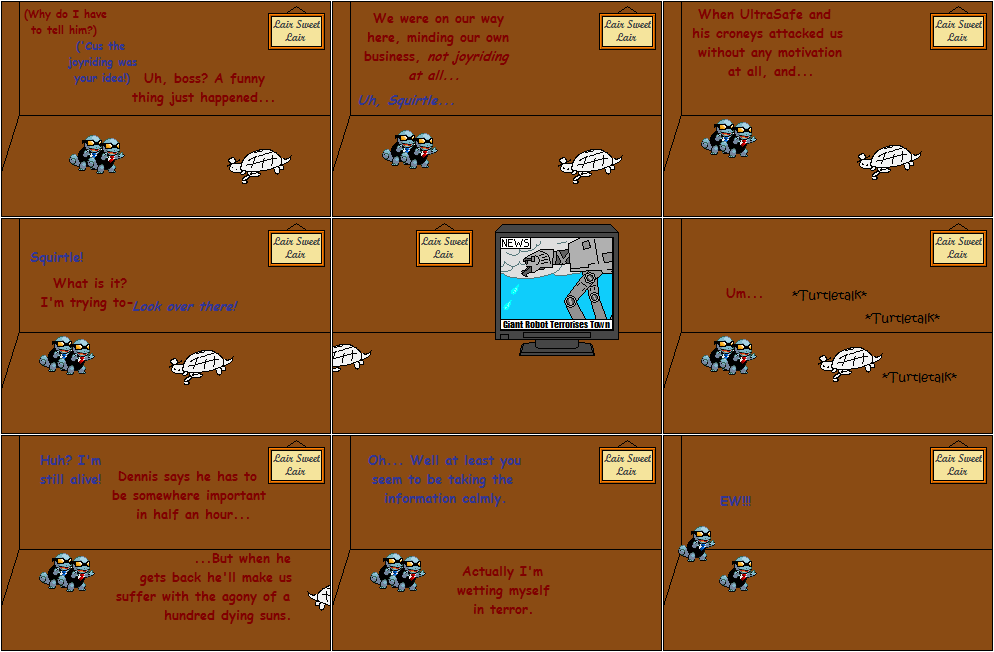 Ok, a little key witht he text, it will all be next to the character who says it, for example, the first box it is MPMPGM, I it's a little confusing, and i'll try and be clearer in who's speaking in what order next time.
