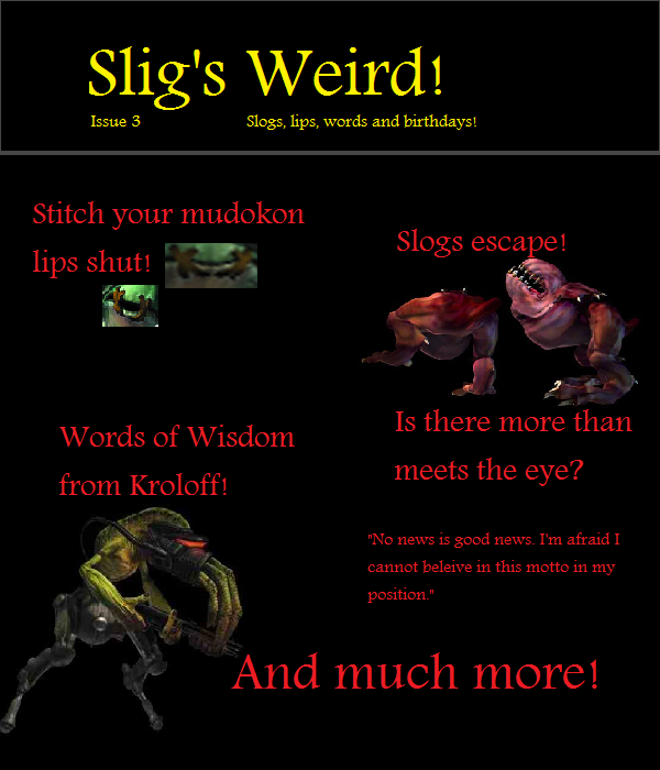 (This is just a bit of fun, so if you dont want anyone to see your contribution to this 'magazine' until the next update is posted, PM it to me, and i will post it in the next update. Or you can just post your idea's here in this thread, but they will be in public veiw so it wont be a surprise the next time SLIG'S WEIRD is updated).