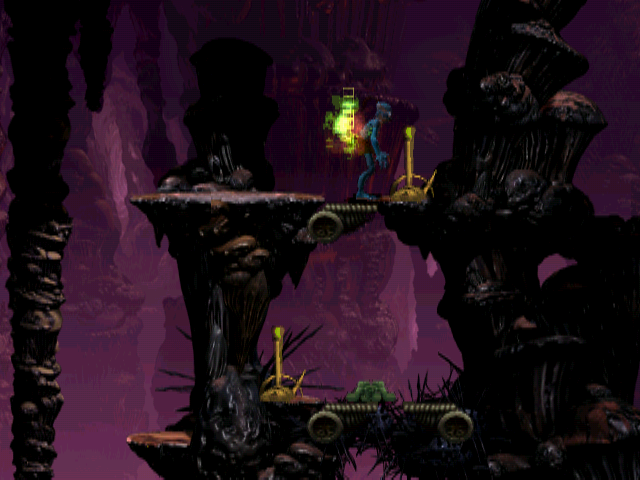 In the other screenshot, I've had fun with the explosive farts, and somehow, THAT happened. I possessed a flying Slig and explored the area, then I realized I wasn't alone