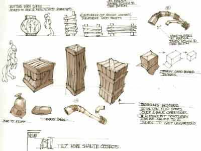 EDIT: I can read "L7 more shante objects" "Bag of stuff" "Sand bags" "Bottoms missing so we can flip boxes and have open ones, # different textures can be # to # # to get variations" "Dirty card board boxes"