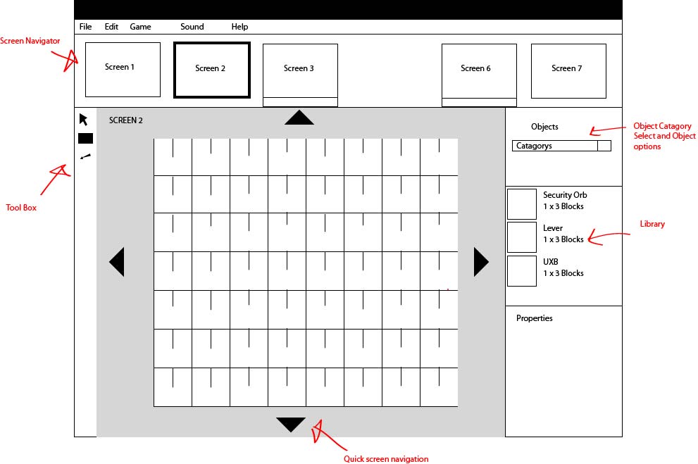 As for the screen editor, my initial idea was to have a layer for each "hight" level and also have a full screen editor to plan out your level. That way, the user has access to a limited navigator when adding objects and triggers and a full screen editor to actually plan his level with added functionality.